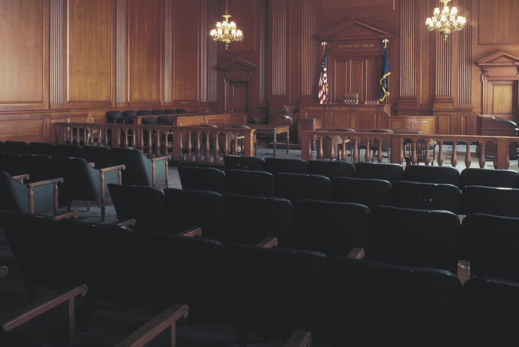 Empty courtroom from behind benches